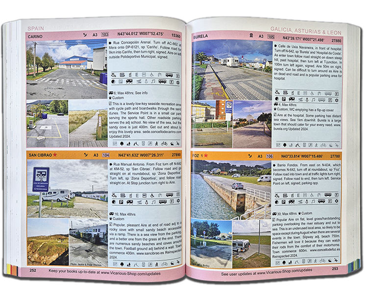 Choosing the right Spanish or Portuguese Aires has never been easier. Service points and parking areas are described, and comments about desirability refine your search. Local amenities and attractions are identified and commented upon. Distances are recorded from nearby towns, shops and restaurants, green spaces for exercising dogs and children, opportunities for fishing, walking, cycling, and local places of interest.